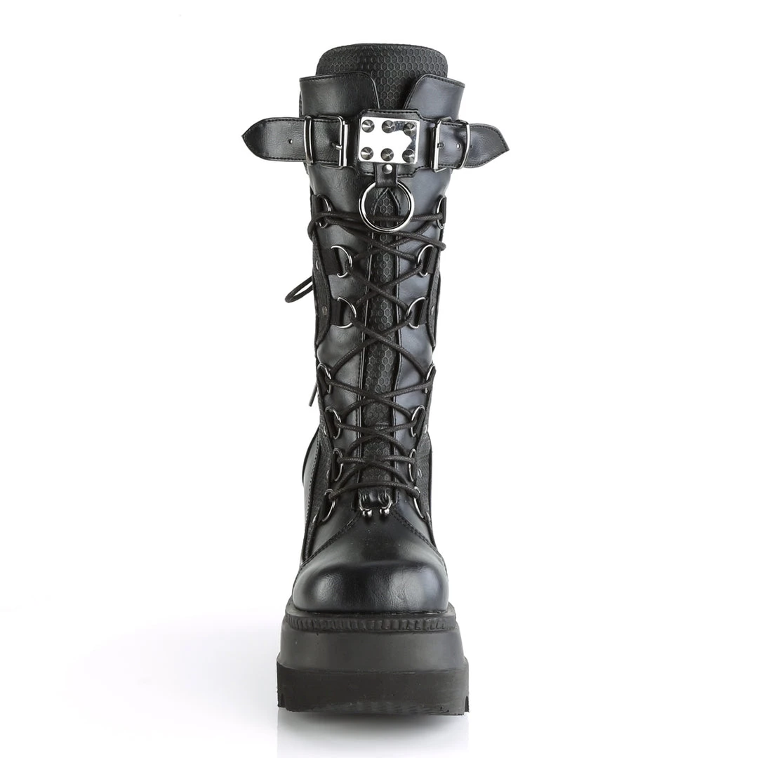 4 1/2″ Wedge Platform Lace-Up Mid-Calf Boot W/ Curvy Contrast Panel Designs on Vamp, Featuring Horseshoe Ring Ornament and Buckle Strap W/ Spike Studded Metal Plate and A Large O-Ring, Metal Back Zip