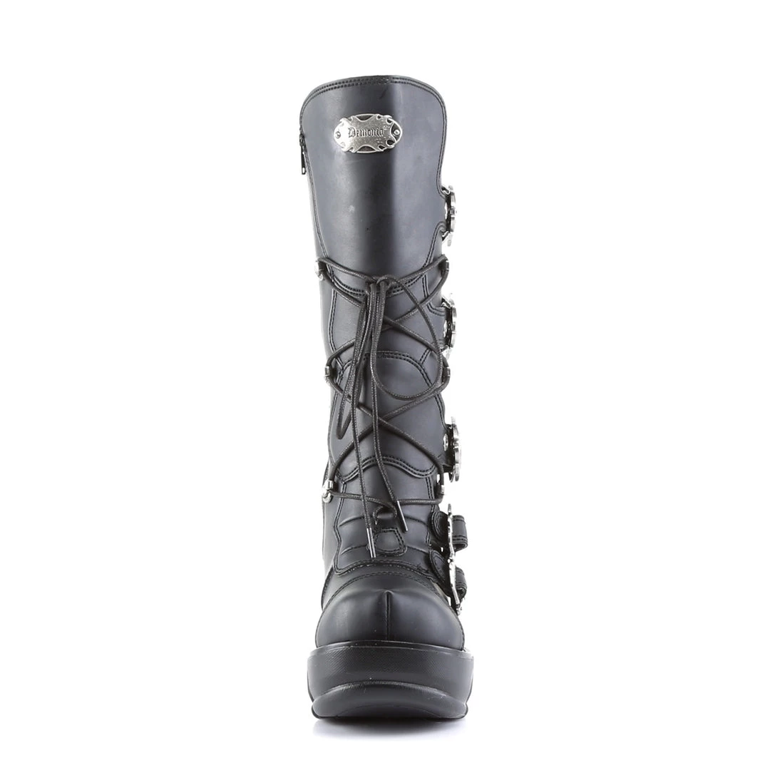 3 1/2″ (89mm) Chromed Heel, 1 1/2″ (38mm) Molded Platform Multi Strap Studded Calf Boot, Full Inner Side Zipper