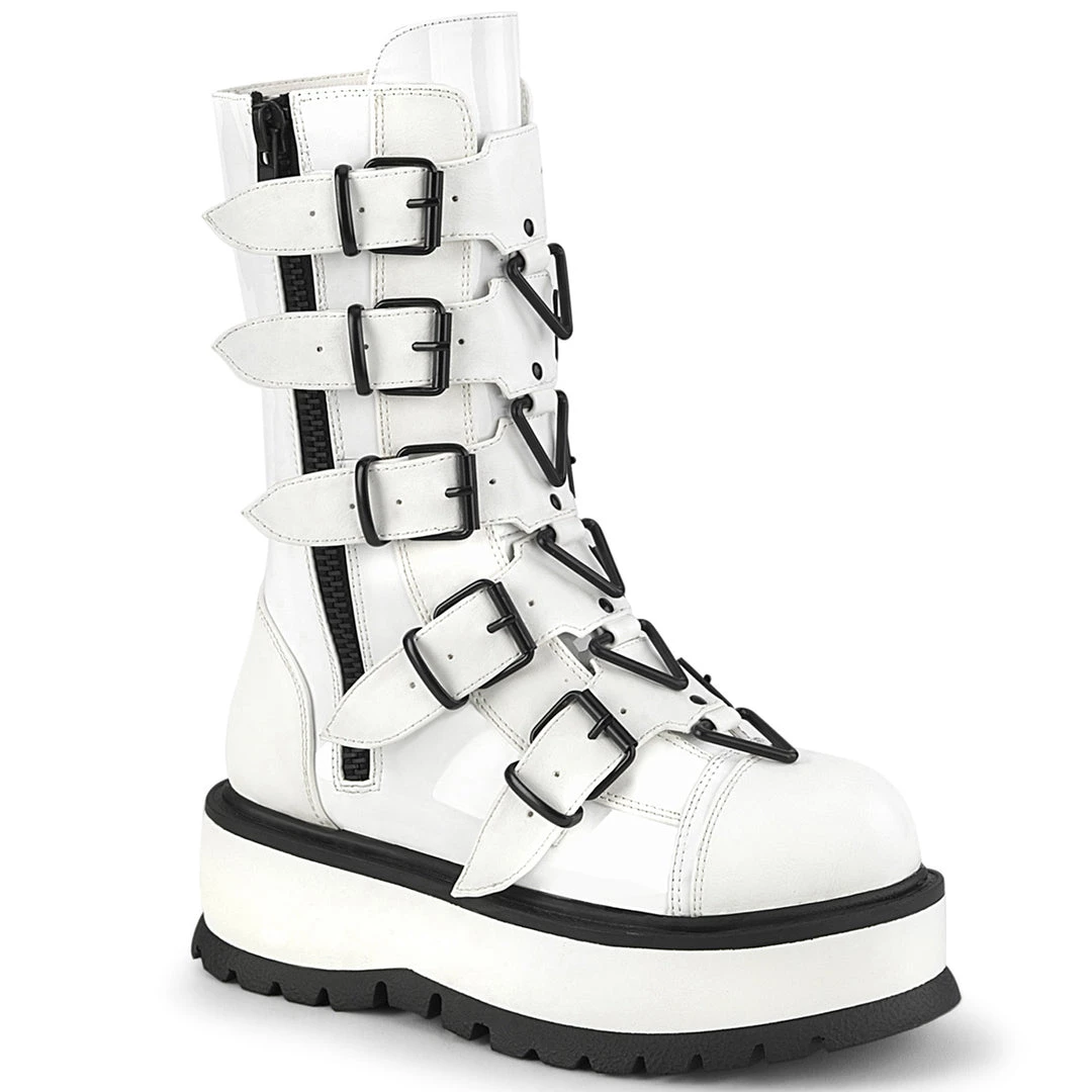 2″ (51mm) Platform Lace-Up Front Mid-Calf Boot Featuring 5 Buckle Straps w/ Metal Triangle Rings at Centerl, Outside Zip Closure