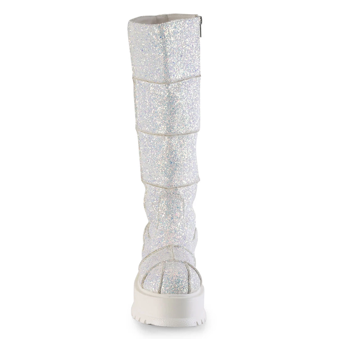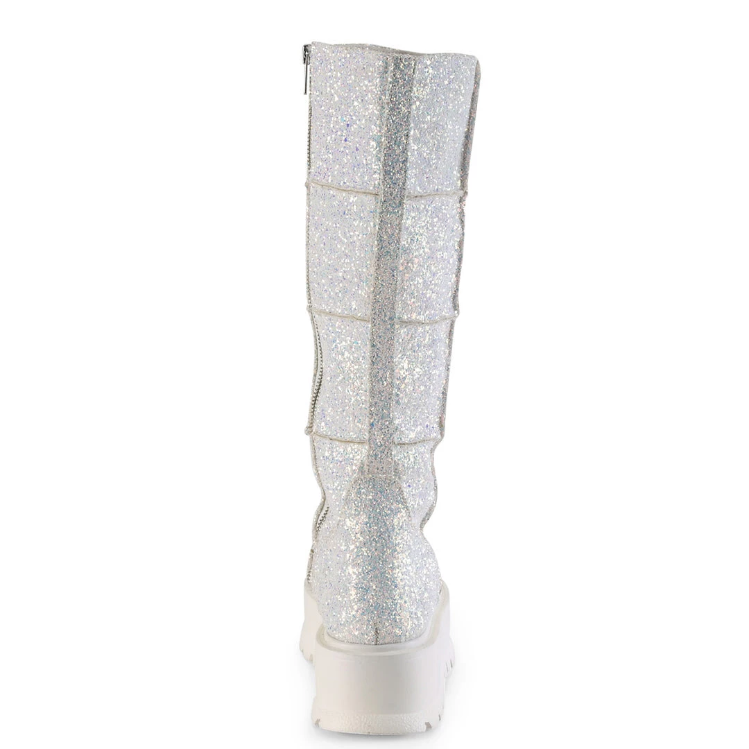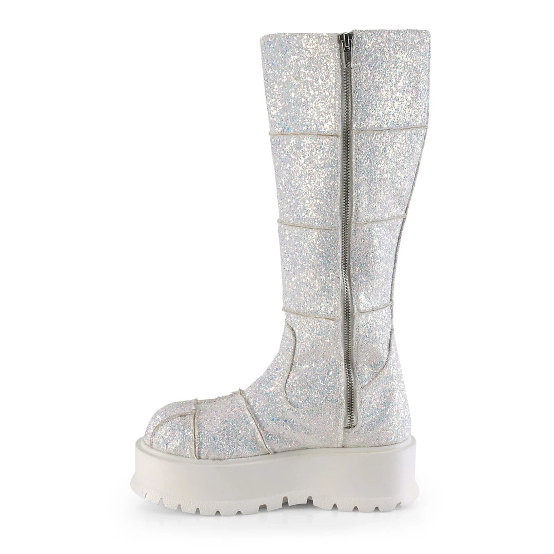 2″ (51mm) Platform UV Blacklight Reactive Knee High Boot w/ Patching Details, Full Length Inner Side Metal Zip Closure