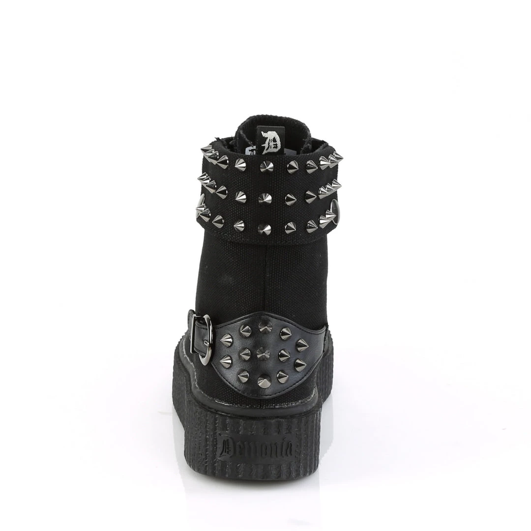 1 1/2″ (38mm) Platform Rubber Sole High Top Round Toe Lace-Up Front Creeper Sneaker Featuring Cuffed Snap Collar and Buckle Heel Strap w/ Stud Embellishments