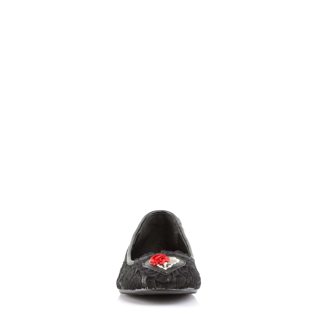 Lace-Overlay Mary Jane Flat Featuring Heart Patch with Ruffle Lace Trim, Embroidered Skeleton Ribcage and Red Rose Detail