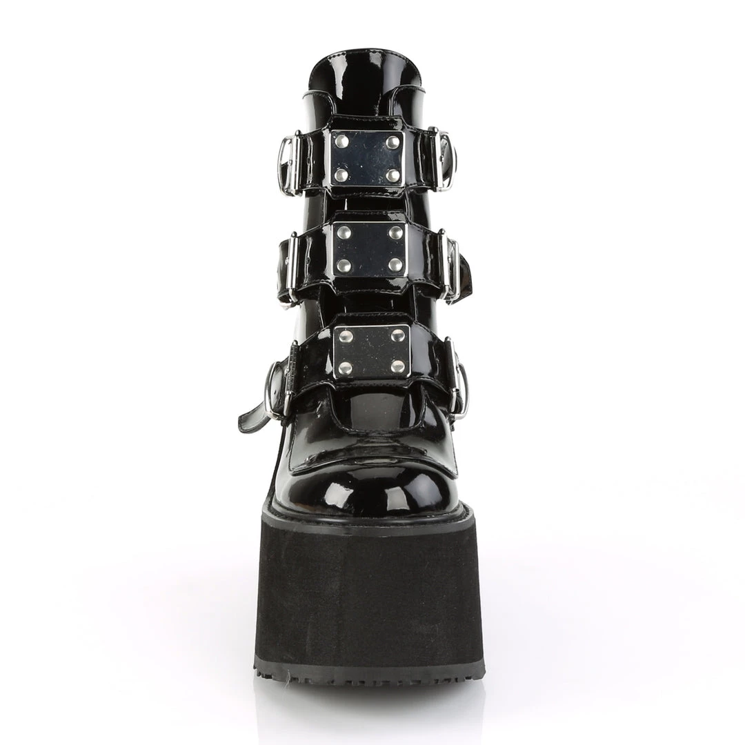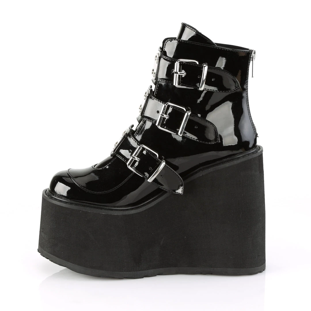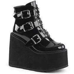 5 1/2″(140mm) Wedge Platform Ankle Boot Featuring Triple Buckle Straps w/ Silver Chrome Plated Metal Plates at Center, Back Metal Zip Closure