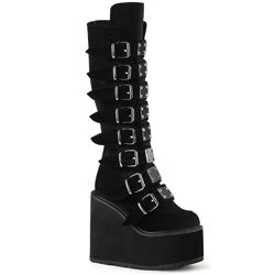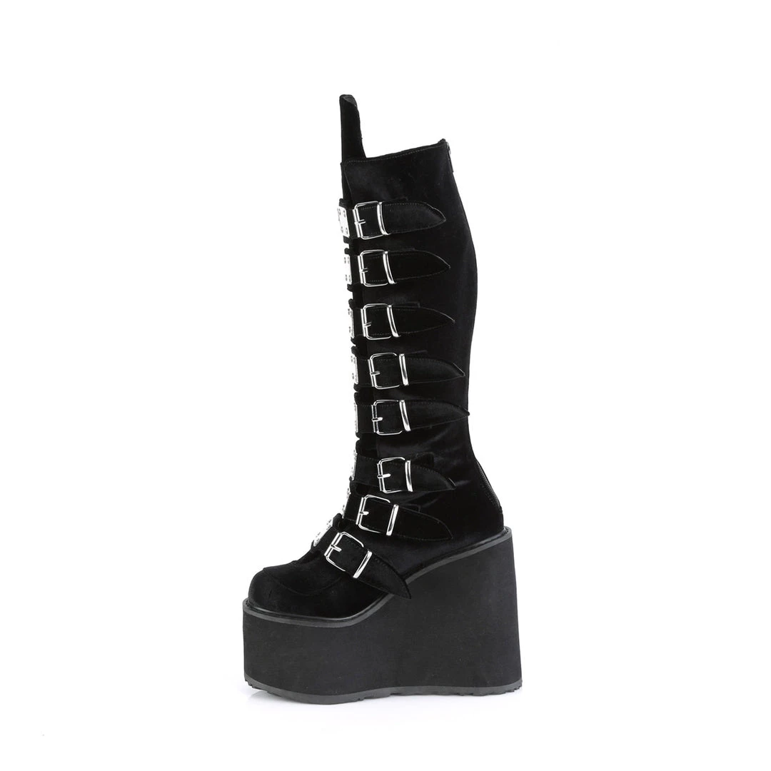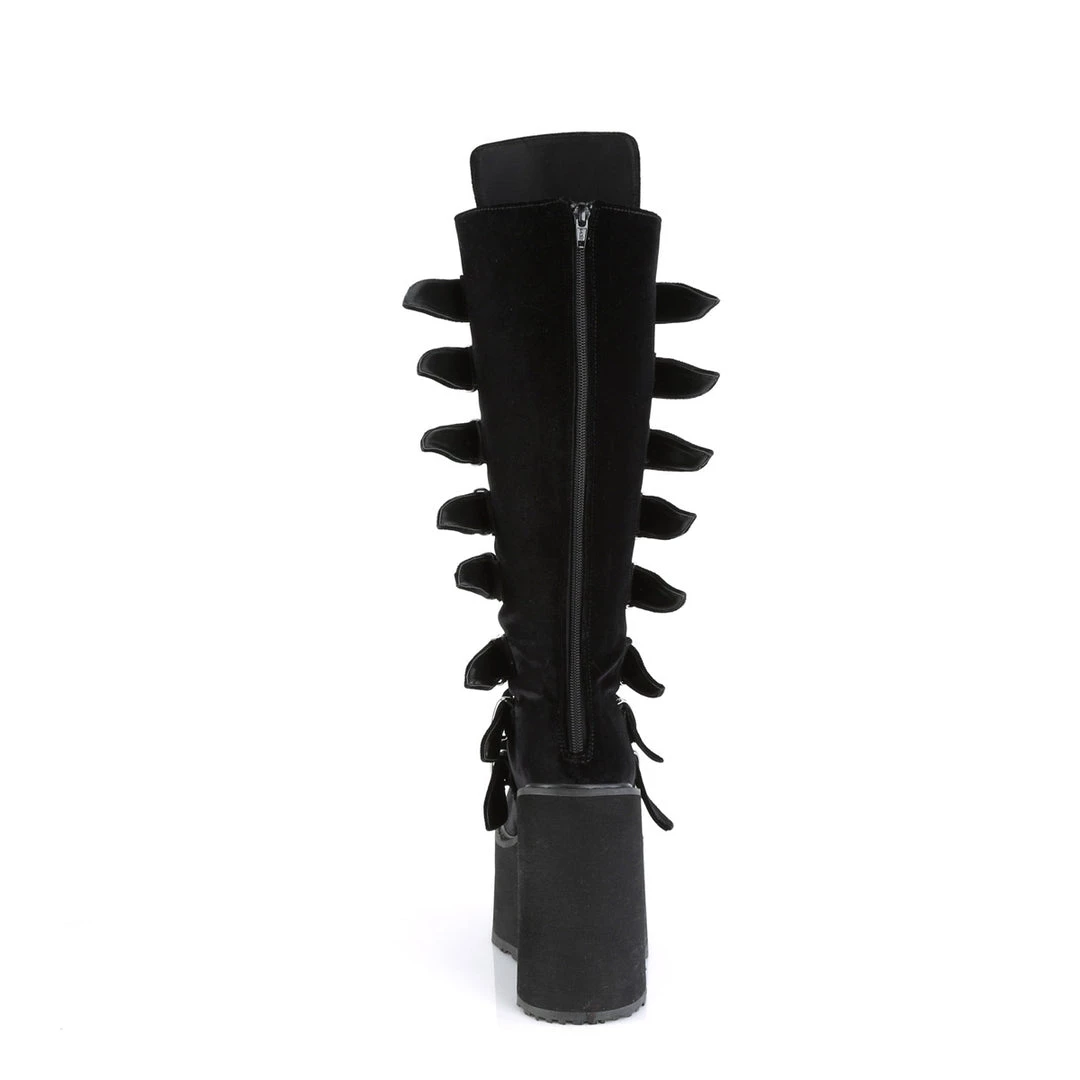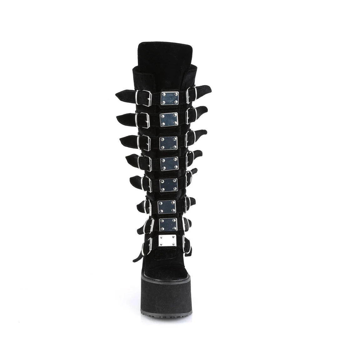 5 1/2″ (140mm) Platform Knee High Boot Featuring 8 Buckle Straps w/ Metal Plates at Center, Back Metal Zip Closure