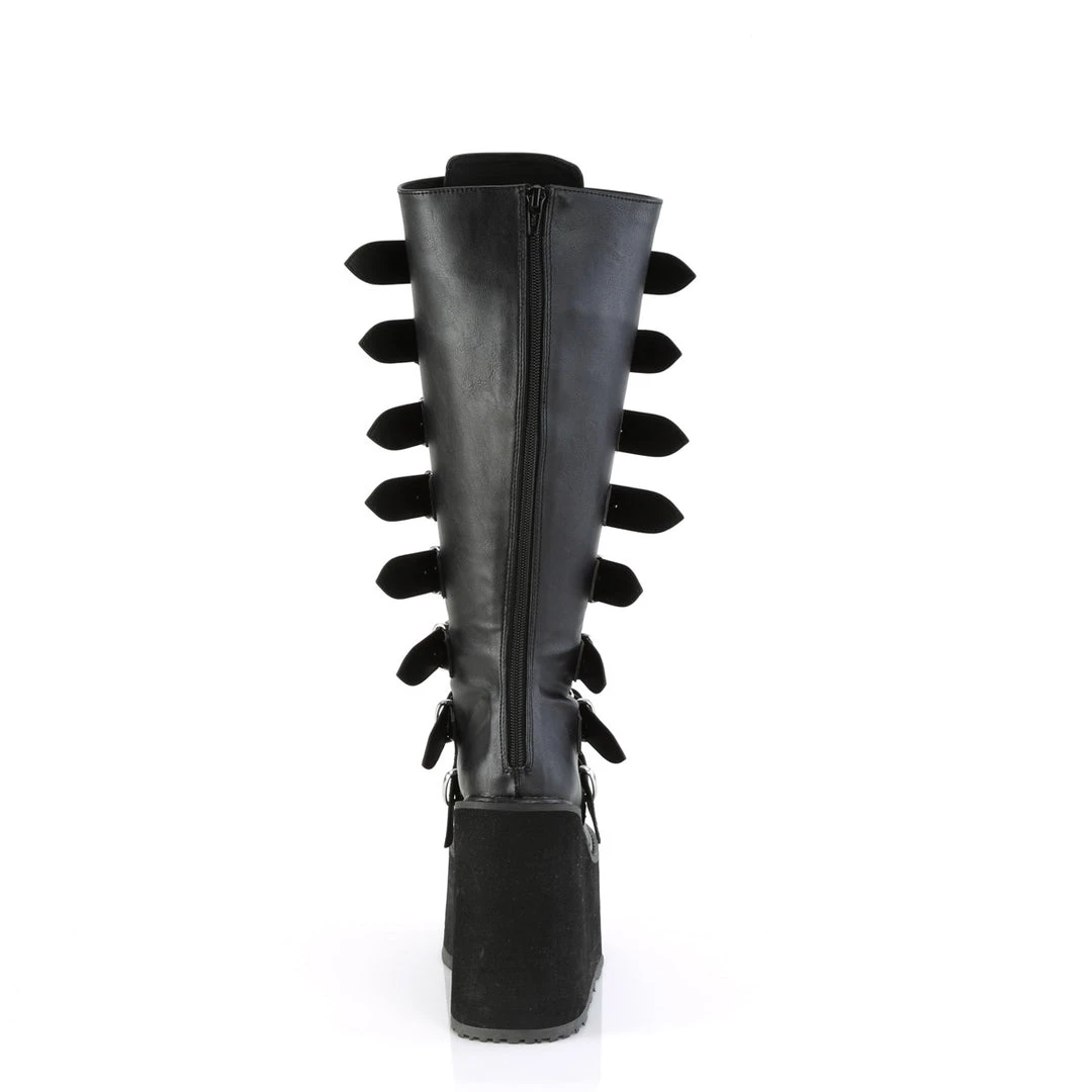 5 1/2″ (140mm) Platform Wide Calf Knee High Boot Featuring 8 Buckle Straps w/ Metal Plates at Center, Back Metal Zip Closure