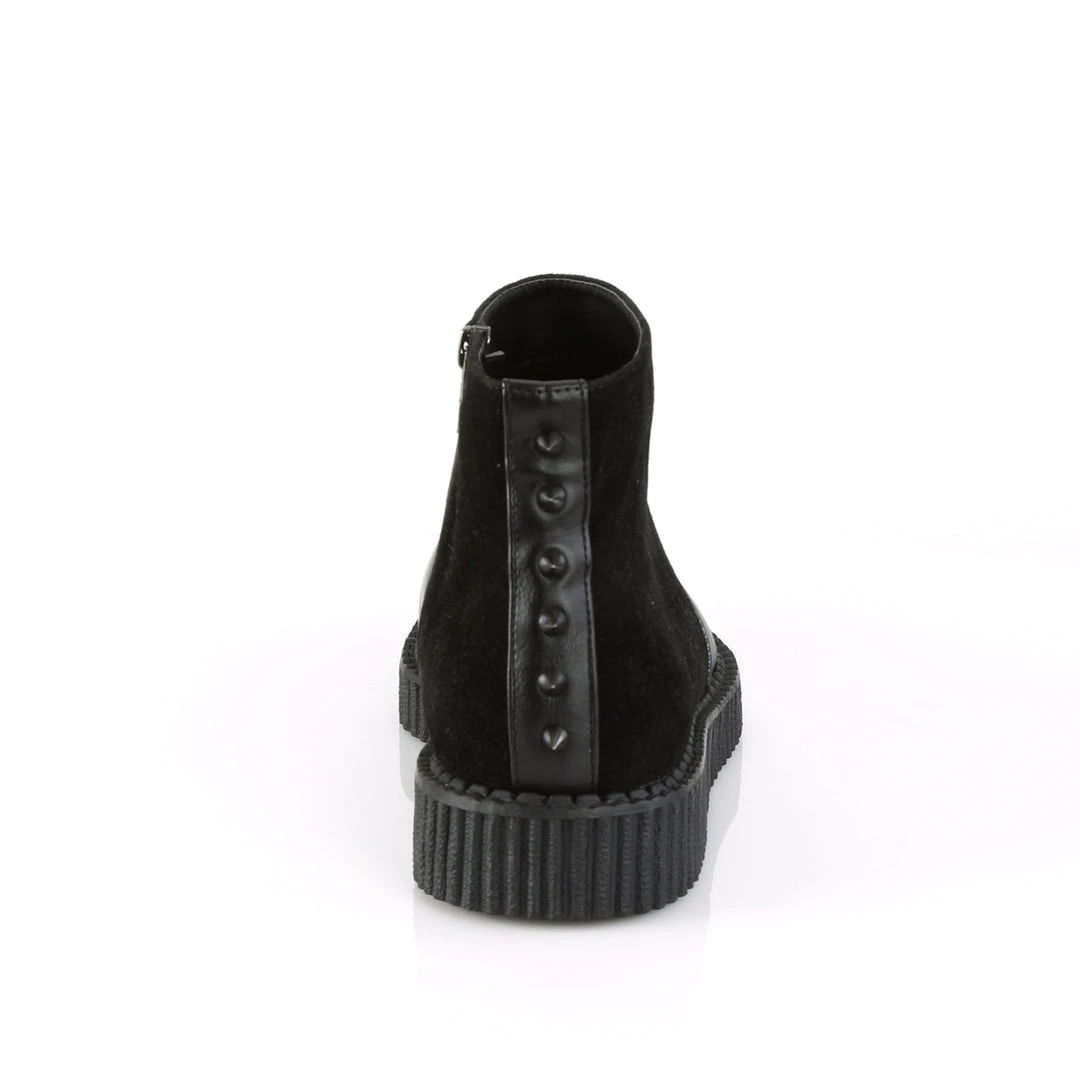 1 1/4″ PF Pointed Toe Ankle Boot Creeper W/ Asymmetrical Zipper Across the Vamp and Cone Studs Up the Back, Metal Inside Zip Closure