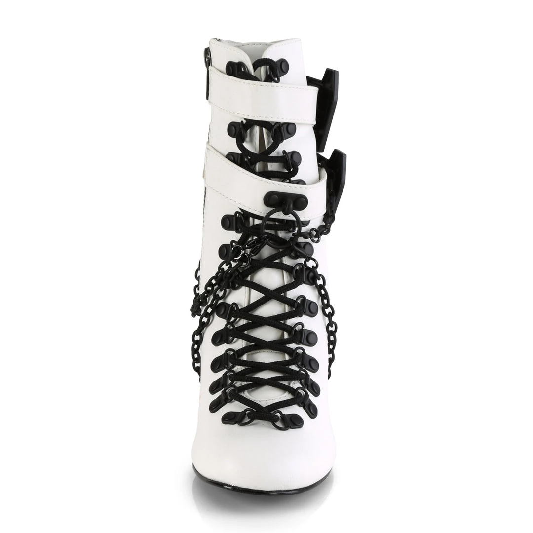 3″ (76mm) Block Heel Round Toe D-Ring Lace-Up Ankle Boot Featuring Double Coffin Buckle Straps w/ O-Ring Plate and Double Hanging Chain Drapped Through the Heel Channel & Wrapping the Heel