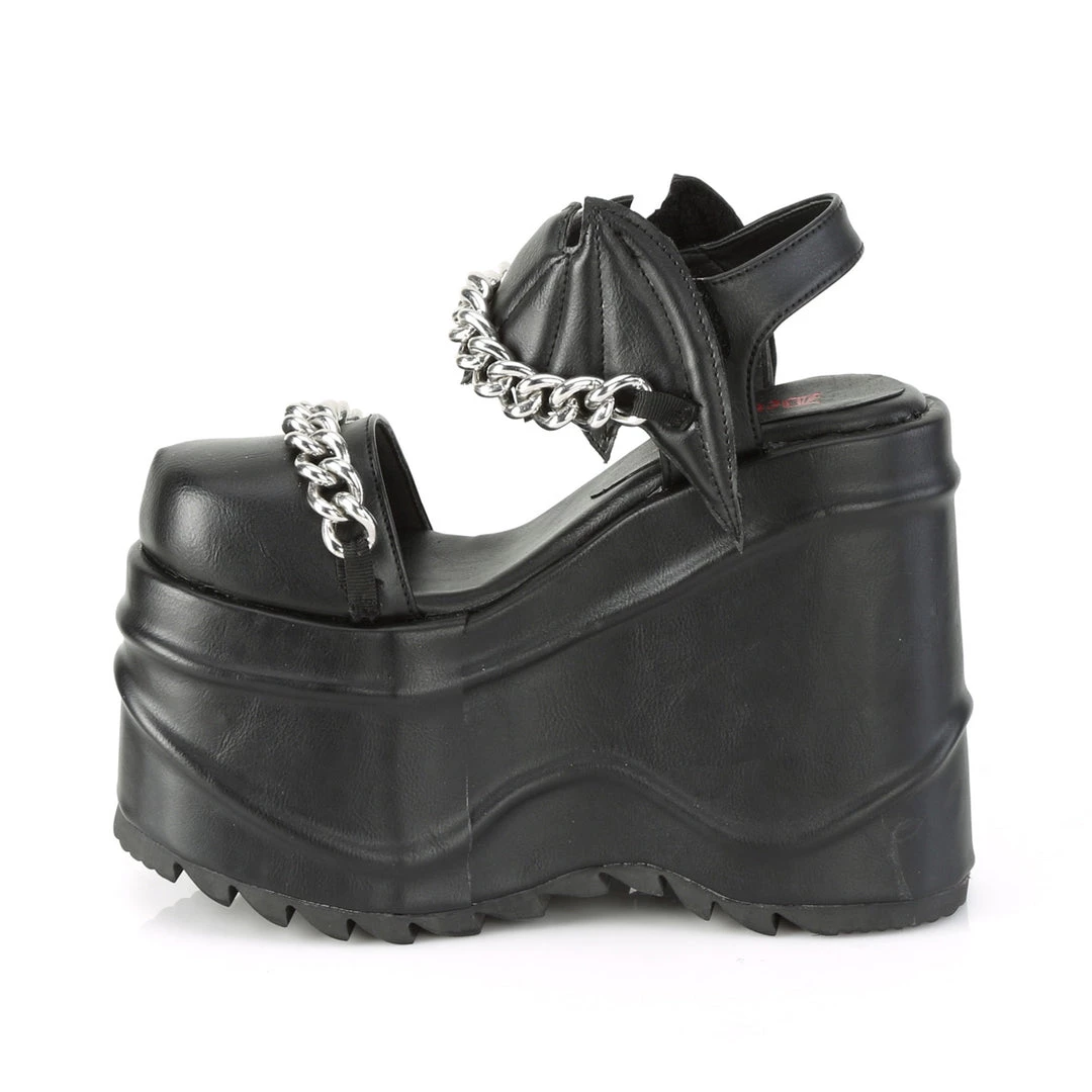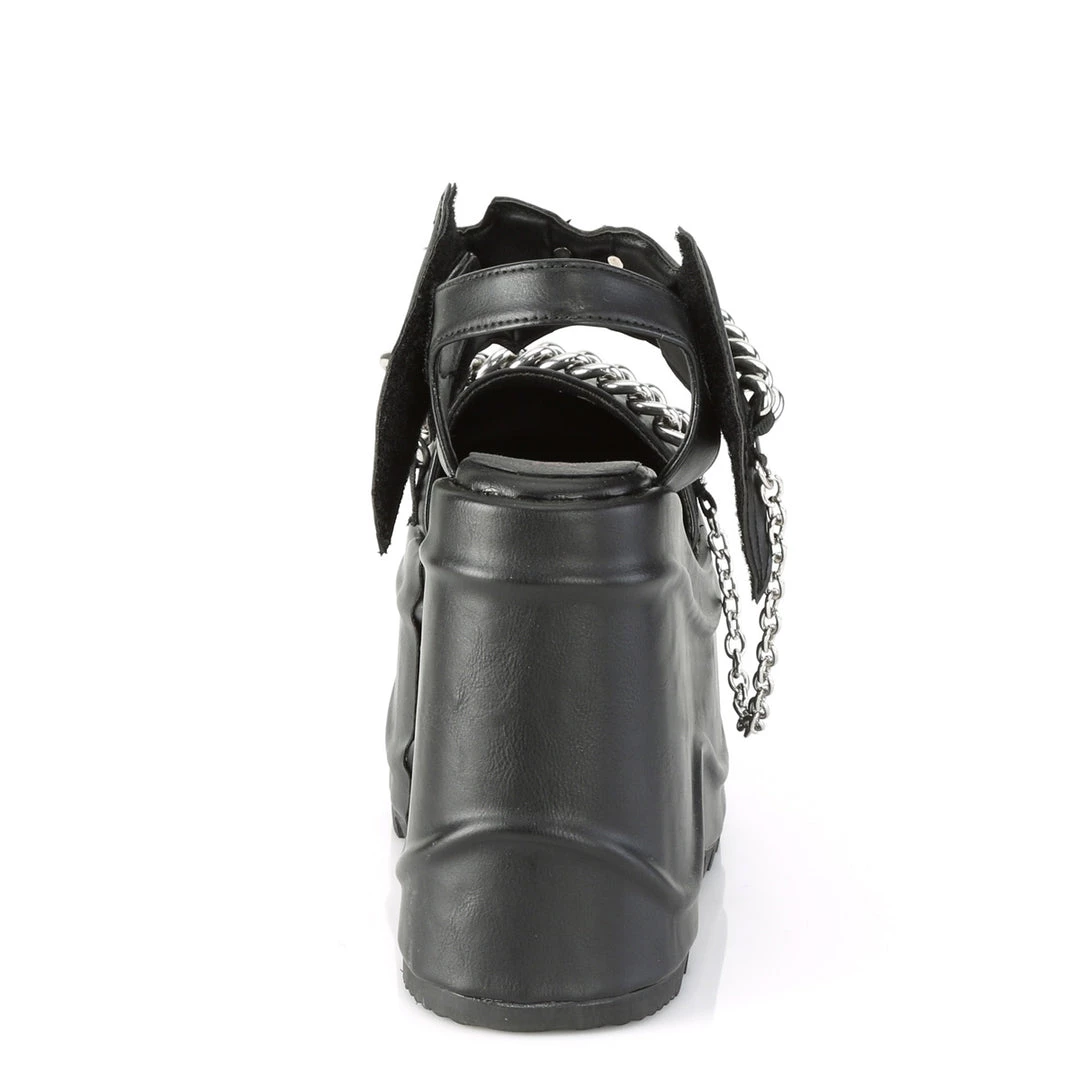 6″ (152mm) Wedge Platform Close Toe Ankle Strap Sandal Featuring Bat Shaped Hook & Loop Ankle Strap Closure, Moon & Chain Details